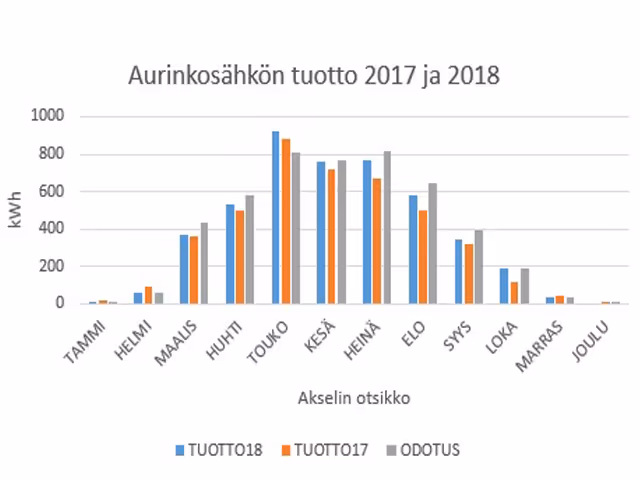 Kuvahan sen kertoo. Viime vuonna sähköntuotto oli käytännössä jokaisena sähköntuoton kannalta merkityksellisenä kuukautena parempi kuin sadekesä vuonna 2017. Ihmekkös tuo, kun vuoden 2018 kesänä Aurinko porotti ja sadetta suorastaan kaivattiin. Vuoden 2018 sähkön kokonaistuotto oli noin 4,572 MWh, mikä on kuitenkin vain noin 8% enemmän kuin vuoden 2017 kokonaistuotto (n. 4,233 MWh). Toisin kuin voisi luulla, kesien eroavaisuudet aurinkoisuuden suhteen eivät näy ehkä sittenkään niin suurena kuin elektronien toteutuneet irtoamiset sähköverkkoon!