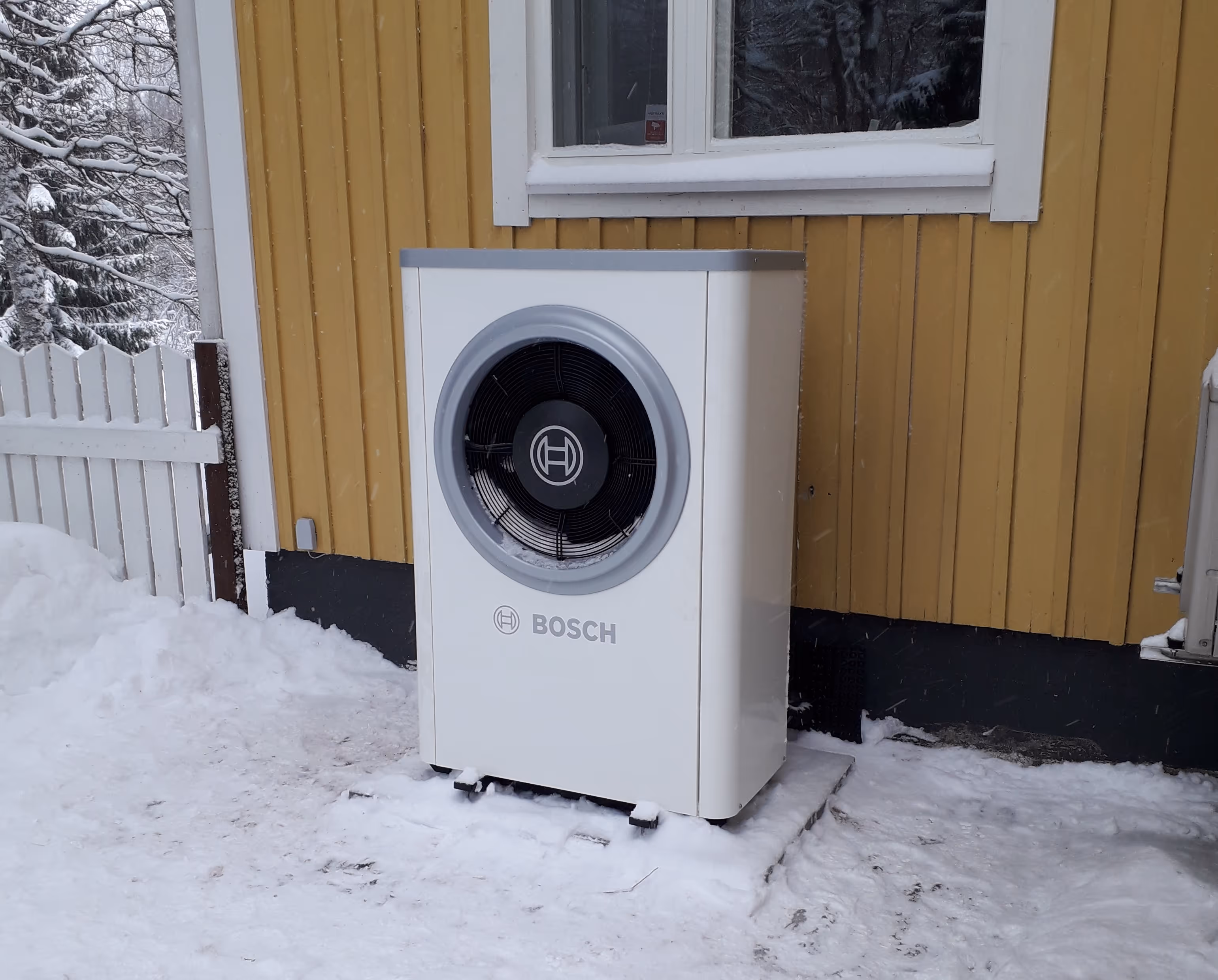 Valitsimme ratkaisuksi ilma-vesilämpöpumpun, joka tuottaa lämpöä ulkoilmasta. BOSCH 7000i vesi-ilmalämpöpumpun hyötysuhde (eli kuinka tehokkaasti ulkoilmasta pystytään lämpöä tekemään) on lähes maalämpöjärjestelmän tasoa - hinta taas on merkittävästi edullisempi! Ilma-vesilämpöpumpun käyttöönotto ei vaadi maalämpökaivon poraamista, joten järjestelmä saadaan nopeasti ja pihaa tärvelemättä käyttöön.