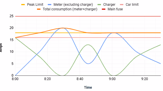 Jos aloitamme latauksen ilman peak shavingia, pysymme juuri ja juuri rakennuksen pääsulakkeen 25 A enimmäisen alapuolella. Käytännössä tämä on dynaamista kuormanhallintaa.